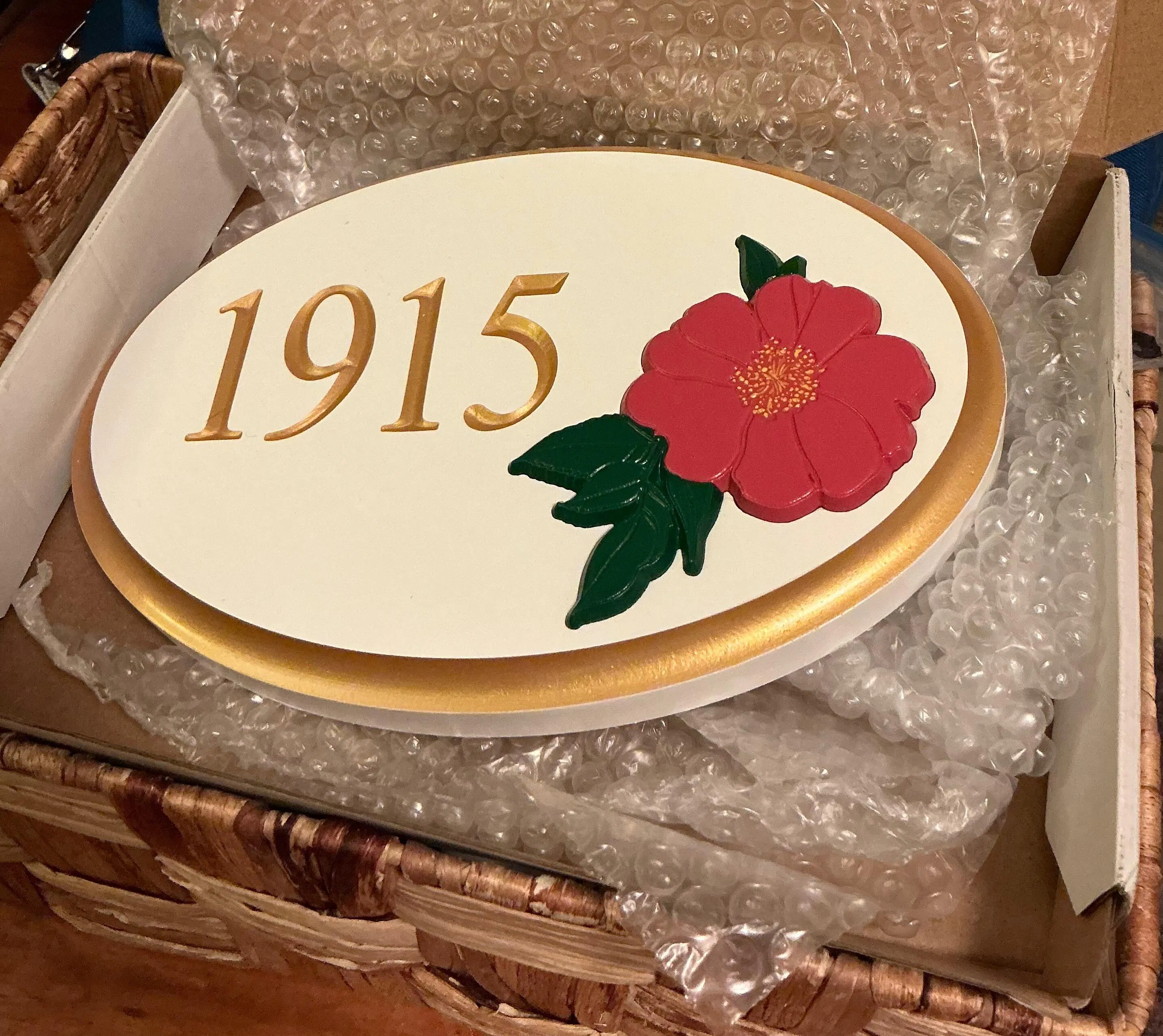 - Other Color Info: Gold border, numbers; Dark pink petals; Green leaves; Yellow center